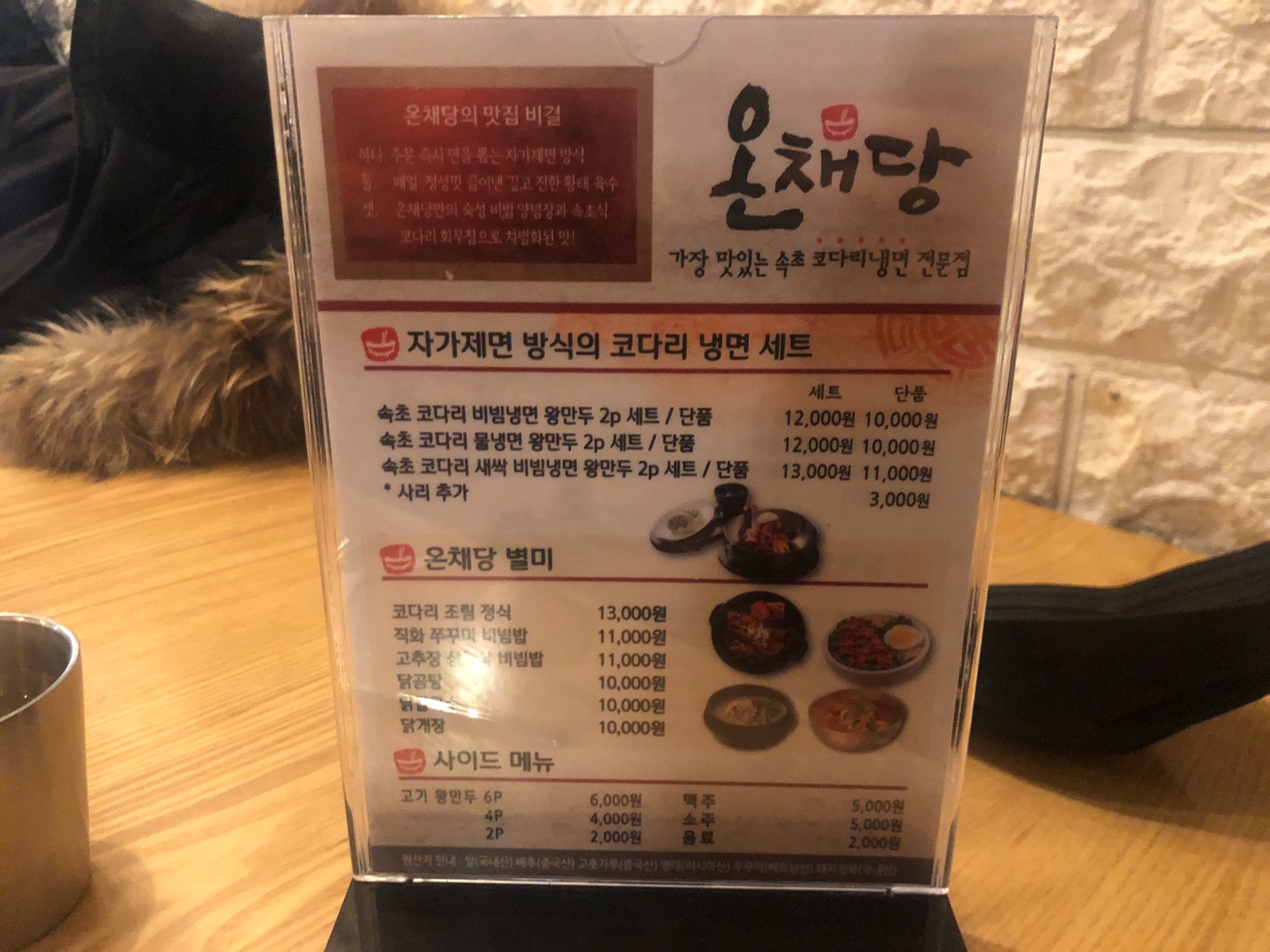 한 끼 식사에 요즘 만 원은 우습게 물가가 올랐다. 우리가 주문한 온채당 비빔냉면 물냉면 단품 가격은 각 1만 원이다. 왕만두 두개를 주는 세트를 시키면 1만 2천 원이다.